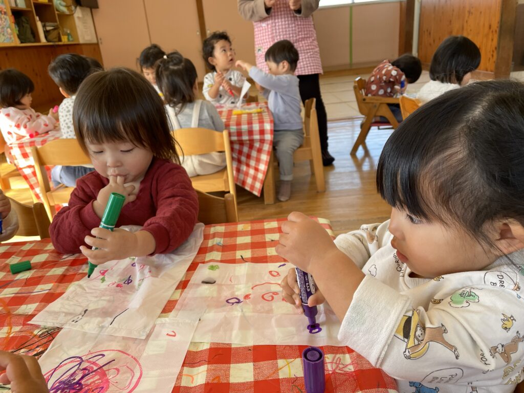 マジックを手に取り、思い思いに線を描いたり、色を重ねたり。