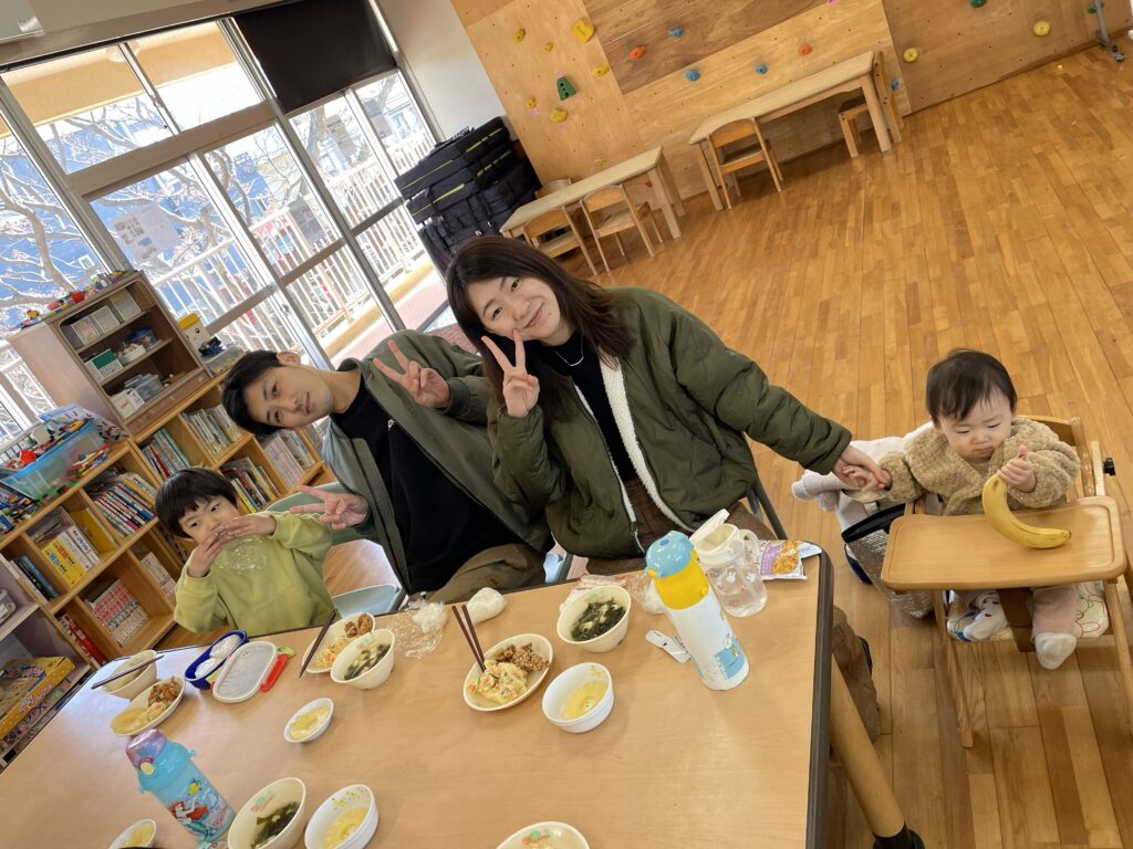 その後は園庭で元気いっぱい遊び、たくさん体を動かしたあとは、親子で給食タイム。お話をしながら食べる給食は、いつもよりいっそうおいしく感じられたようです。