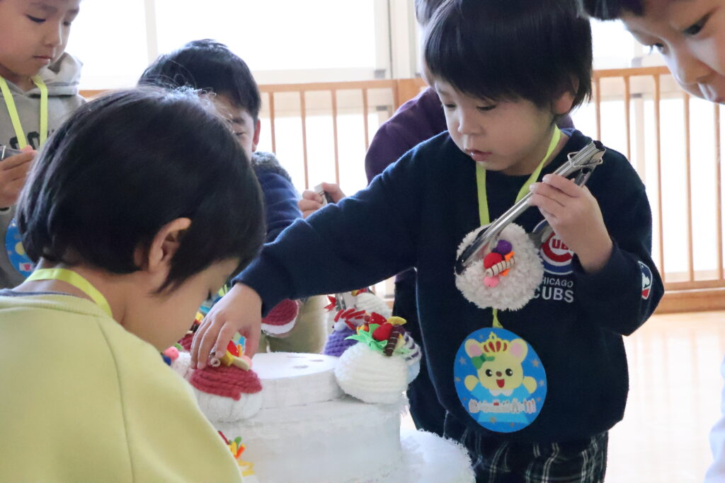 インタビューの後は、みんなでフェルトのケーキ作り。飾りを思い思いにのせて、世界に一つだけの素敵なケーキができあがりました。続いて先生たちの出し物では、笑顔と笑い声があふれ、楽しいひとときとなりました。