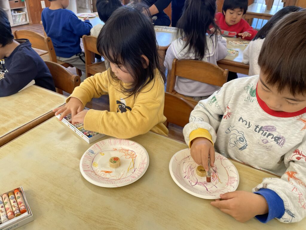 園では、お正月遊びを楽しみながら、ゆったりとした時間を過ごしています。3歳のお友達は、紙皿を使って駒づくりに挑戦しました。色を塗ったり模様を描いたりと、思い思いに工夫しながら、世界にひとつだけの駒が完成しました。