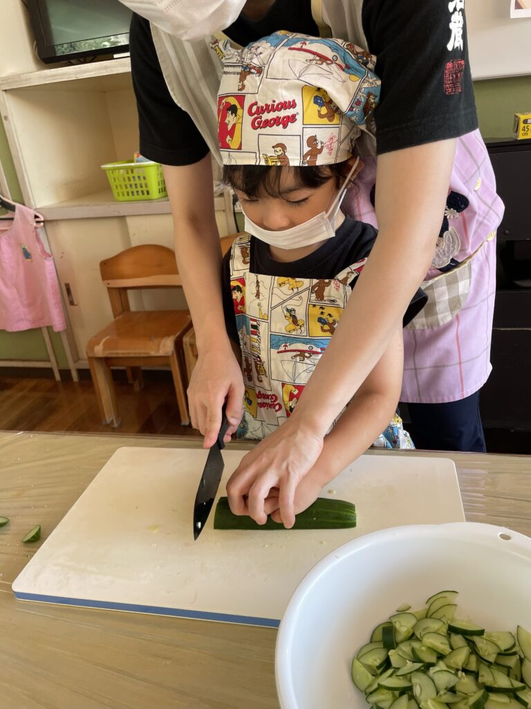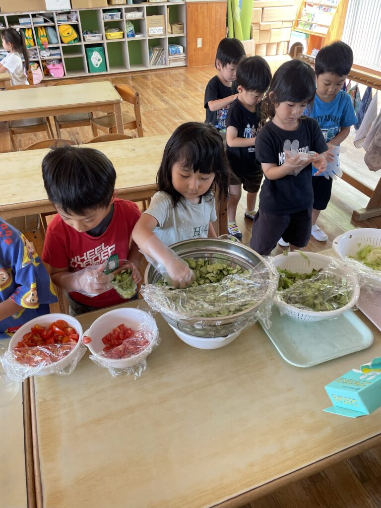 今日は、待ちに待ったサラダパーティの日。みんなで育てたピーマンや畑で採れた夏野菜を使ってクッキングを楽しみました。まずは、透明のボトルにそれぞれ好きな野菜を入れて...「せーのっ!」でシェイク!いろどりの野菜が混ざっていく様子に子供たちも大興奮でした。そしてびっくりしたのはここから。普段は野菜がちょっと苦手なお友達が自分で作ったサラダをぺろりと完食。「おいしい」「もっと食べたい」という声まで聞こえてきて、クッキングの力って本当にすごいなぁと感じました。みんなで作って、みんなで食べる時間はやっぱり特別。またーつ、夏の思い出が増えたね。🌞