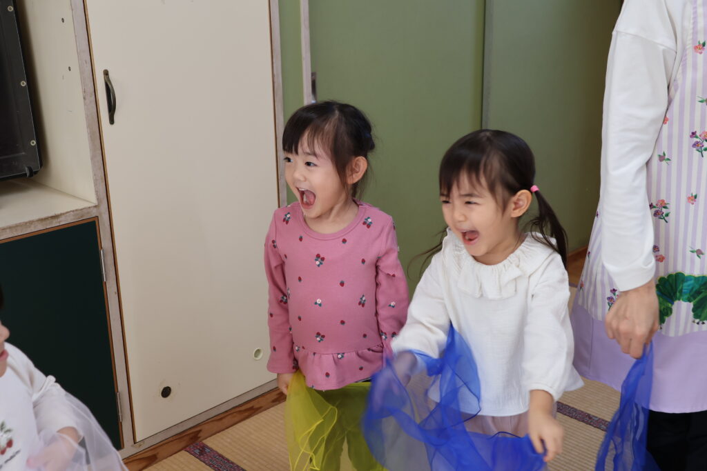 オーガンジーの布を使って「いない いない ばあ」をして遊びました。
