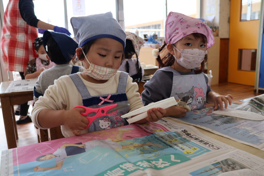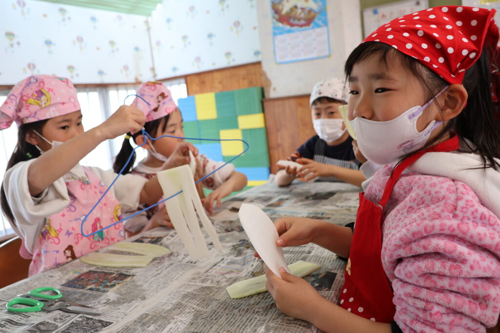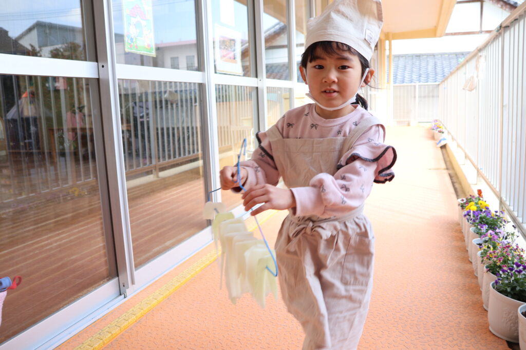 子どもたちは、はさみを使って大根にそっと切れ目を入れ、先生と一緒にハンガーへ。並んで揺れる大根を見上げながら、「おいしくなるのかな?」「いつ食べられるの?」と、わくわくした声がたくさん聞こえてきました。