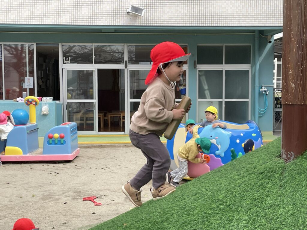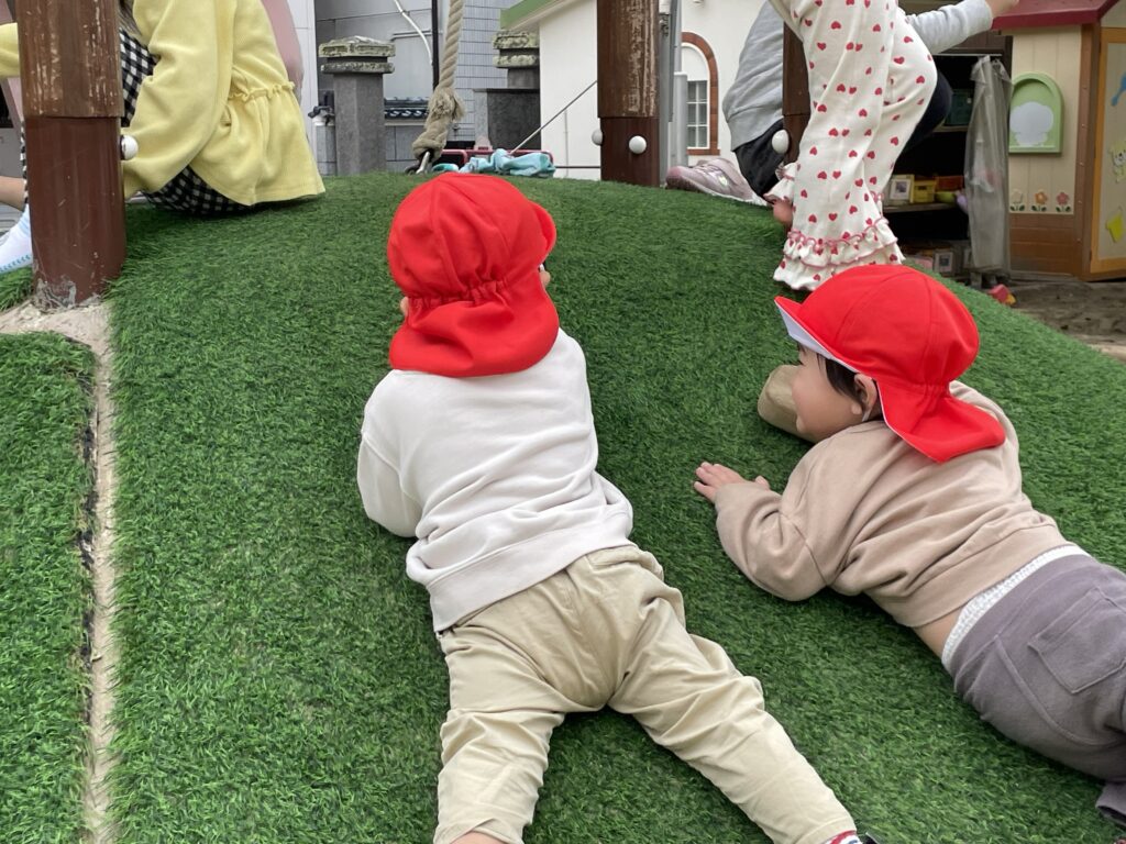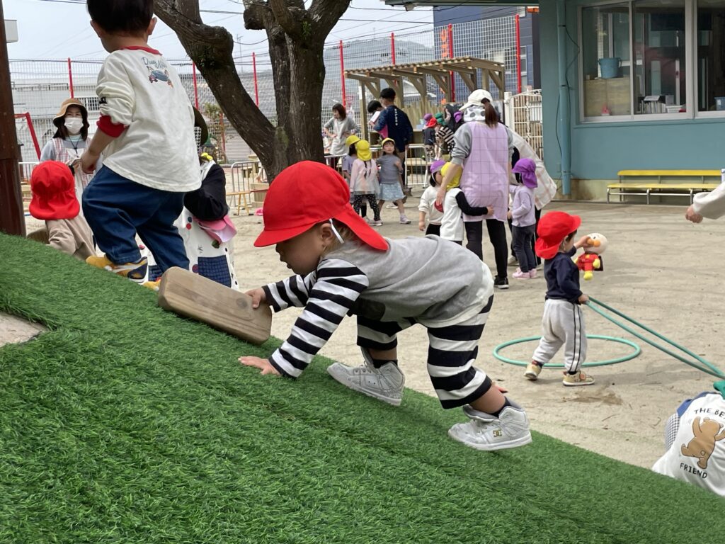 園庭にある登り台は、子どもたちに大人気の遊び場です。お尻で上手に滑ってみたり、腹ばいになってゆっくり降りてみたりと、それぞれが自分なりの楽しみ方を見つけています。中には、おもちゃや身近な物を持って登ったり、一緒に滑らせたりと、遊び方もどんどん広がっている様子です。