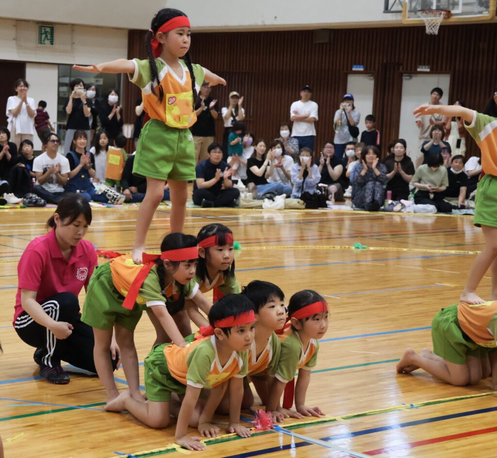 園庭での大運動会を楽しみにしていましたが残念ながら雨、体育館での開催になりました。急遽、体育館での開催になりました。子供たちが迷わないようフィールドやポイントを付けて準備。今年は、初めての5月開催の運動会でしたが、1月から少しずつ取り組んでいた組体操もバルーンもいつも通り元気いっぱいできました。保護者の方々からは、「体育館の方が見やすくて良かった!」という声もありました。でも、やっぱり、青空の下で思い切り走りたかったですね。来年こそは、お天気に恵まれますように。