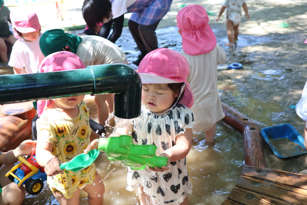 冷たい水の感触に、大喜びの声が園庭に響きました。
