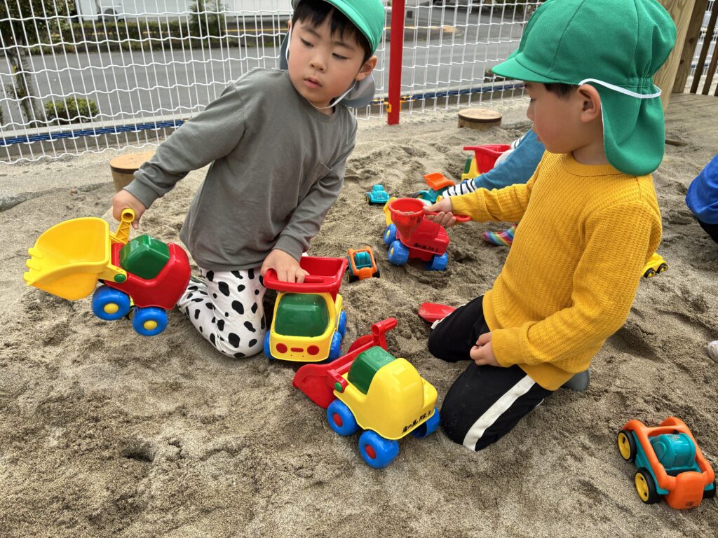 今日は、園庭の砂場コーナーに新しく砂場道具を用意しました。バケツやスコップ、ショベルカーにダンプカーなど、子どもたちが思い思いに遊べるおもちゃが並びます。