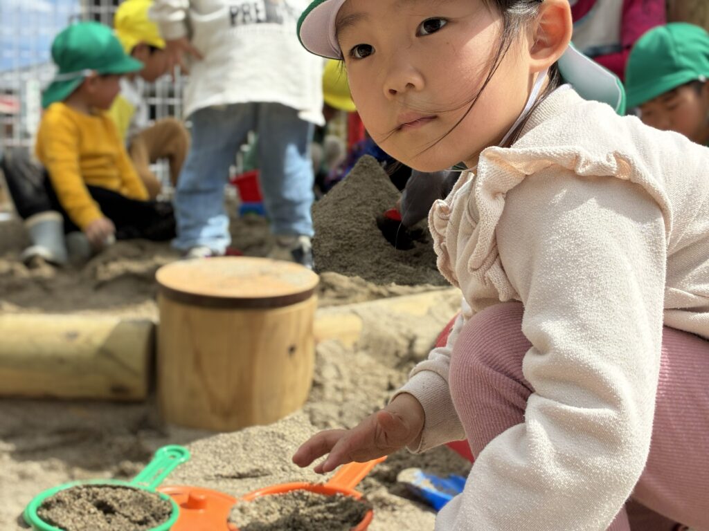 「いっぱい入ったよ!」「ケーキみたい!」と嬉しそうな声も聞こえてきて、砂遊びの楽しさがどんどん広がっていく様子が印象的でした。