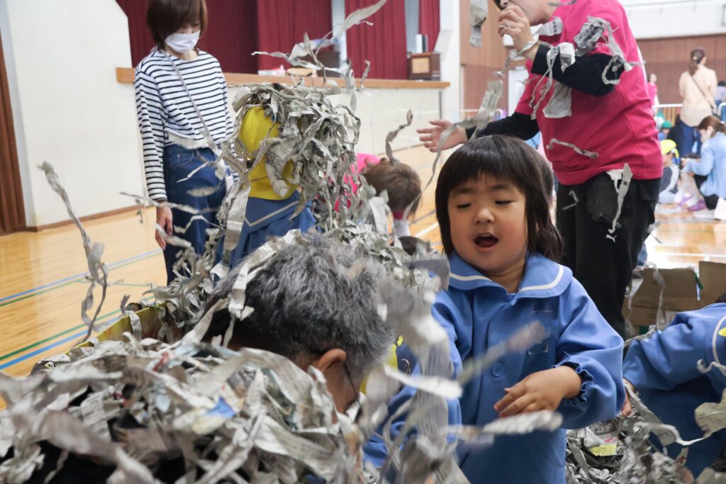 海浜公園に行く予定でしたが残念ながら雨。代わりに総合体育館に変更しました。お遊戯やレクレーションの後、新聞紙プールや大型絵本、ブロック、おもちゃなど広い体育館いっぱい使って遊びました。雨の日でも場所を変えて楽しく過ごせることに感謝です。