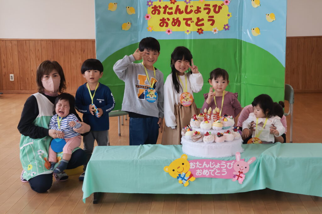 今日は、4月生まれのお友達の誕生会を行いました。お名前や好きな食べ物をみんなの前で発表してからケーキ作りに挑戦。フェルトで出来たかわいいケーキは、職員の手作り。出来上がったケーキの中から好きなケーキをひとつ選んでお持ち帰りしました。その後、先生たちの出し物を楽しみ、最後に親子で記念撮影を撮りました。笑顔いっぱいの楽しい誕生会でした。3歳児以上は、その後親子で給食を食べました。