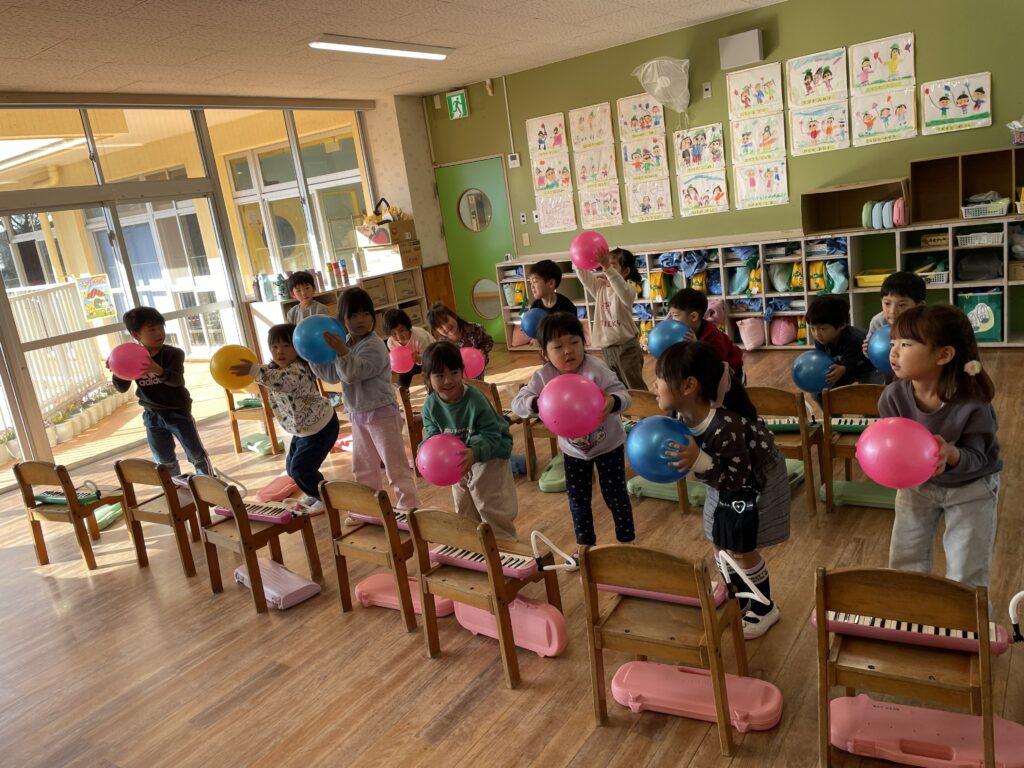 今回の音楽遊びでは、音の高い・低いをボールの動きで感じ取りながら、楽しんで活動しました。ボールが上に上がると高い音、下に下がると低い音をイメージし、体を使って音の変化を体感します。その後は鍵盤ハーモニカを使い、実際に音を鳴らして確認。自分で音を出す喜びを味わいながら、友だちと一緒に音の世界を楽しむことができました。笑顔いっぱいの、楽しい音楽遊びの時間となりました。