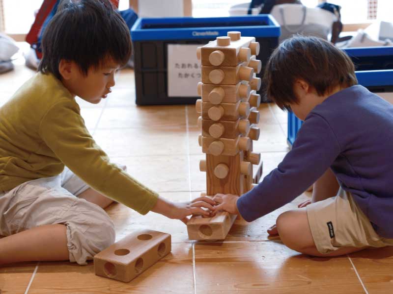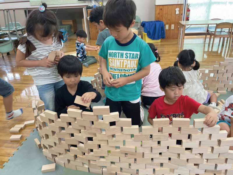 積み木を使って、自分の発想で形をつくったり、友だちと協力して大きな作品を使ったりしています。積んだり並べたりする中で、集中力や空間認識能力、創造力が自然と育ちます。できあがった作品には子どもたちの思いが詰まっていて、遊びの中から学びが生まれます。