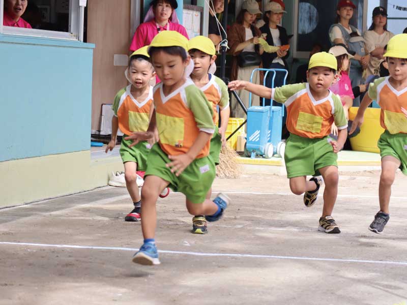 運動会は子どもたちが体を動かし、競技する楽しい日です。乳児クラスは保護者と一緒にプログラムに参加します。