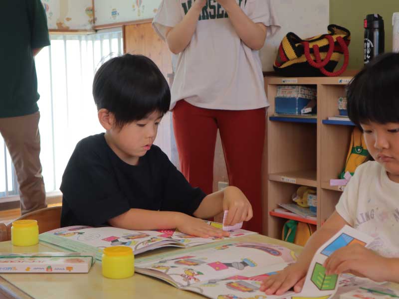 当園では「はじめてのはさみ」「ワーク」を段階的に導入しています。指先の巧緻目と手の協応力、集中力を育むことで、自信と達成感を感じながら楽しく取り組める環境を整えています。