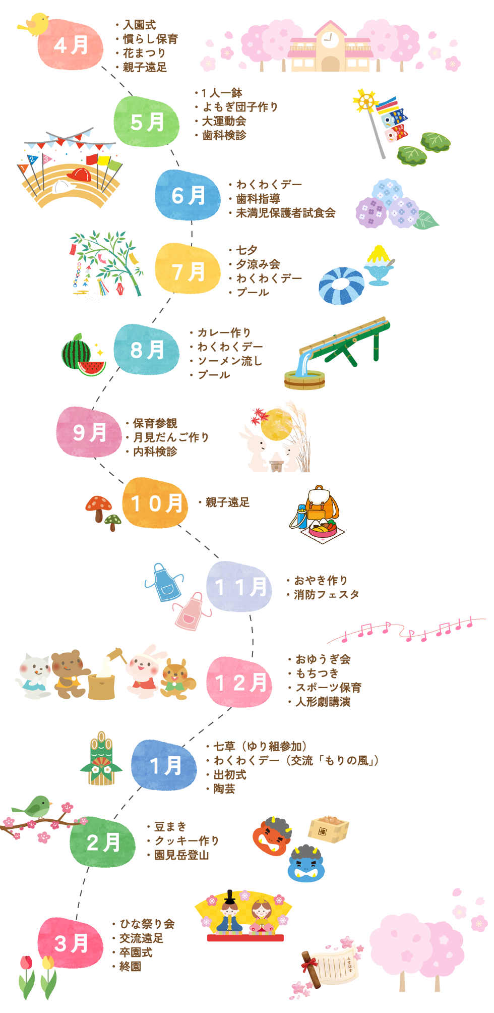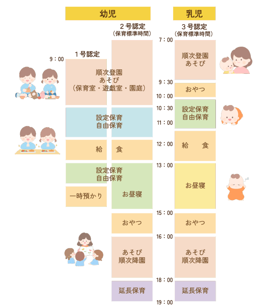 [ptimeline color="pink" marker="tl-img"] [ti label="7:00~" title="開園・随時登園"]親御さんとバイバイするのが辛くても、お友だちと遊んですぐに楽しい笑顔に。[/ti] [ti label="9:30~" title="おやつ"]未満児は朝のおやつがあります。[/ti] [ti label="10:00~" title="朝の会"]クラスのみんなの顔を見て、朝のご挨拶。健康観察をしたり、今日の活動を確認したりします。