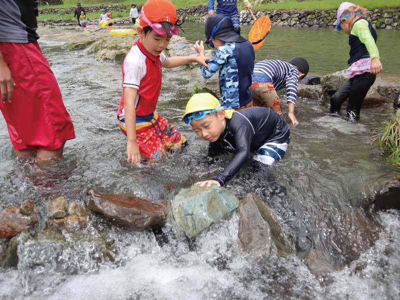 川遊びや国見岳登山、森での自然の中で思い切り体を動かしながら五感を使って学んでいます。